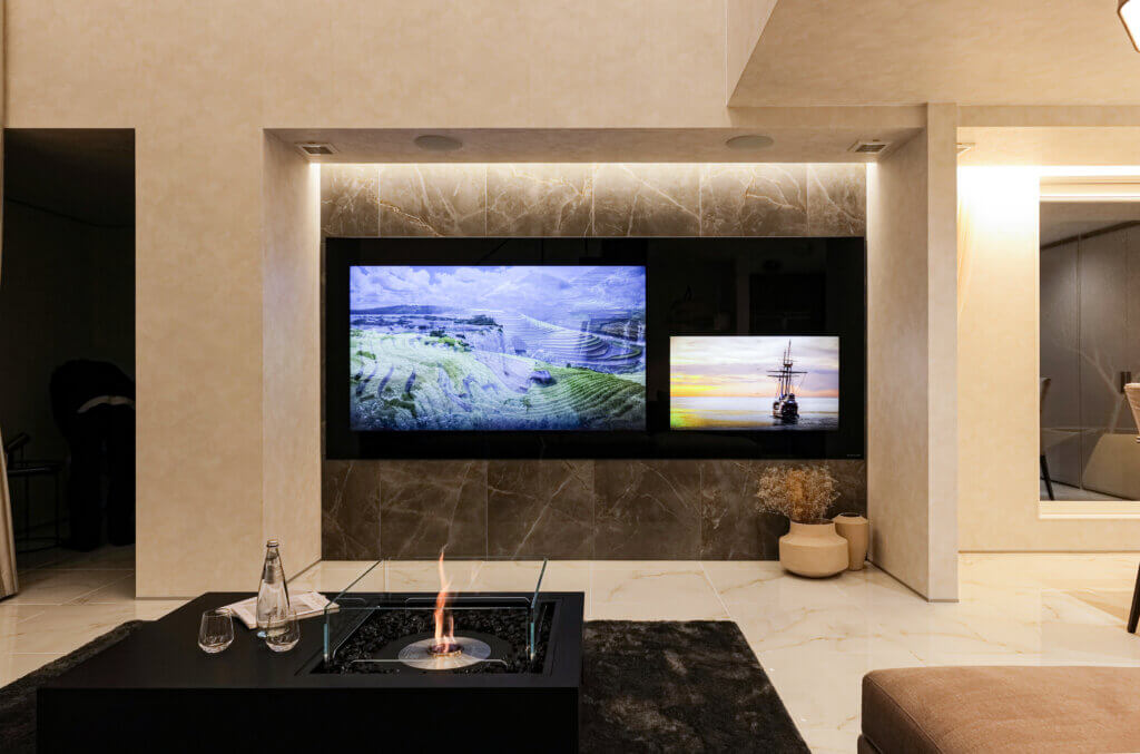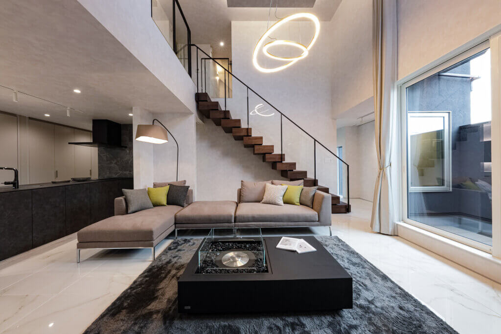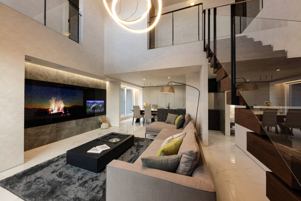 リビングには吹き抜けを採用し、圧倒的な開放感を実現。さらにドレープが美しい電動の大型カーテン、TVモニターの存在を感じさせない空間を実現するグラスルーチェ、意匠性の高い照明・階段など妥協のない空間を演出。