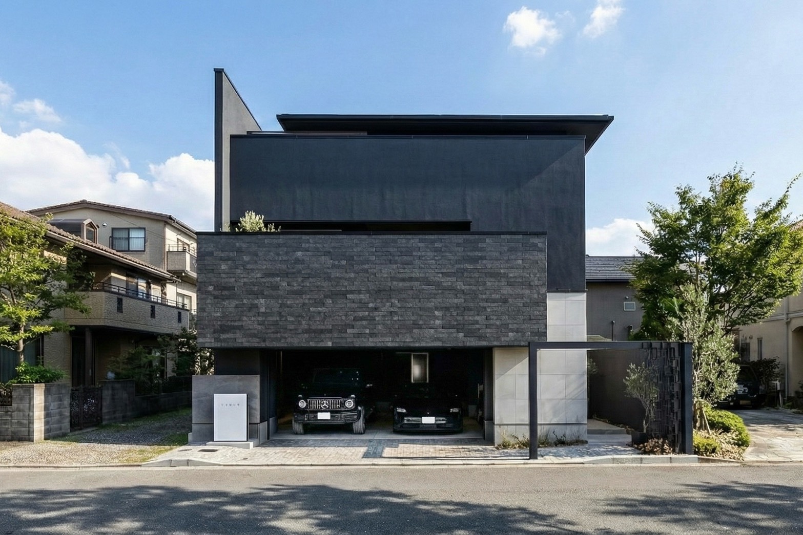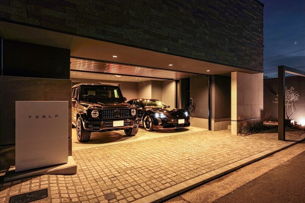 大型輸入車2台を悠々と格納でき大開口ガレージ。シンプルでありながら重厚なイメージのオーバースライディングドアは高速かつ静音性に優れています。ガレージ内にはタイヤなども収納できる大型の収納スペースを確保しました。