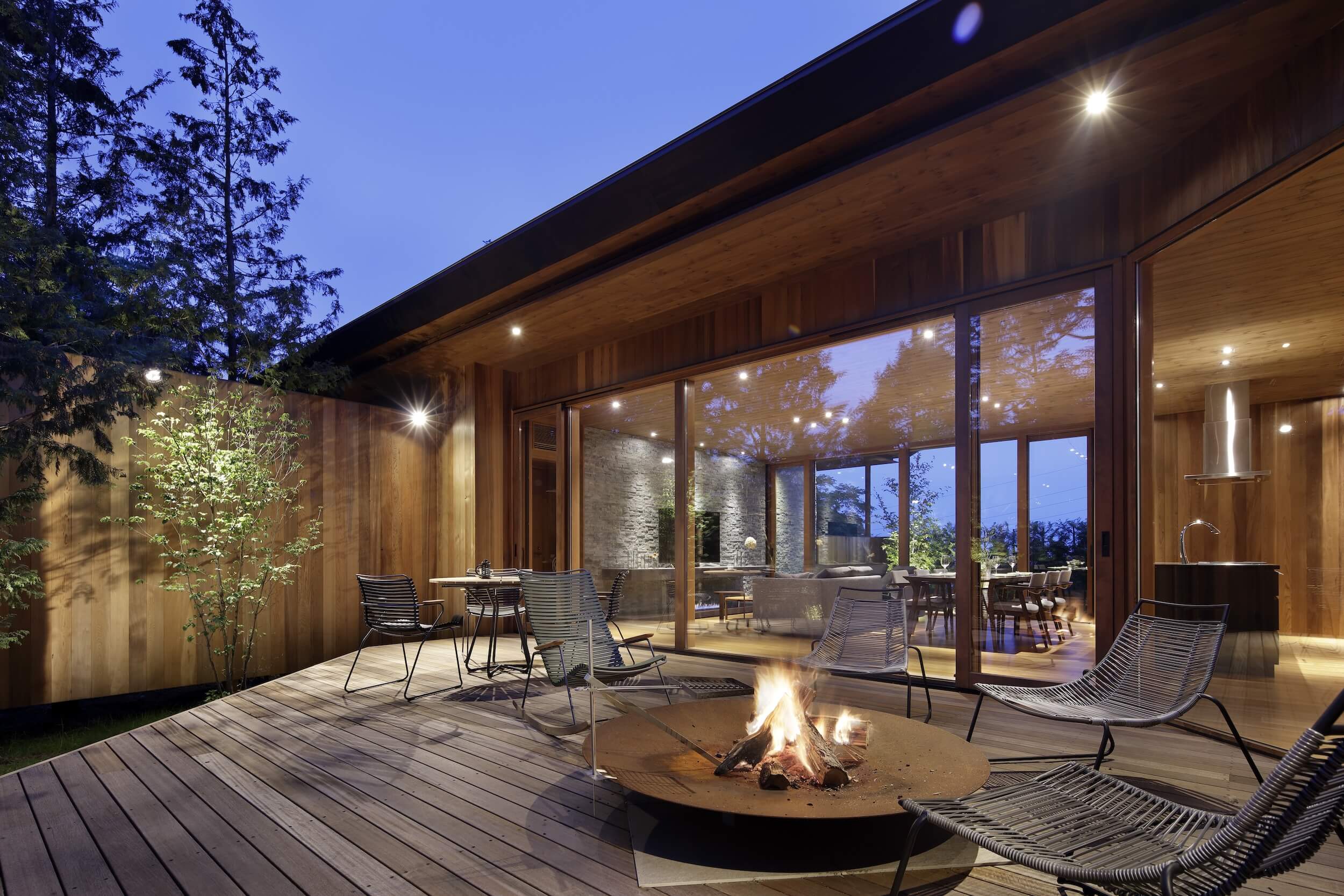 木立の中に溶け込むように佇む、天然木と石張りのコントラストが美しい平屋(※または2階建て)の住まい。 リビングの大開口を開け放てば、広々としたウッドデッキと室内がひと続きのアウトドアリビングに。 鳥のさえずりを聴きながらの朝食や、木漏れ日の中で楽しむBBQ。 四季折々の森の表情を間近に感じながら、心身ともに解き放たれる、上質な非日常の時間がここにあります。