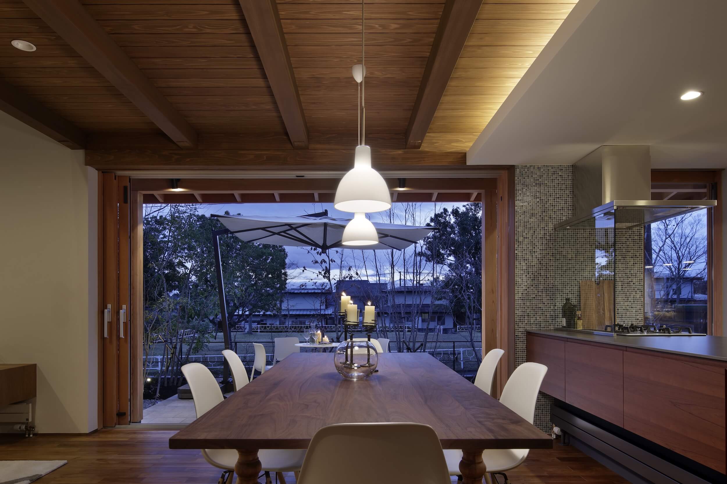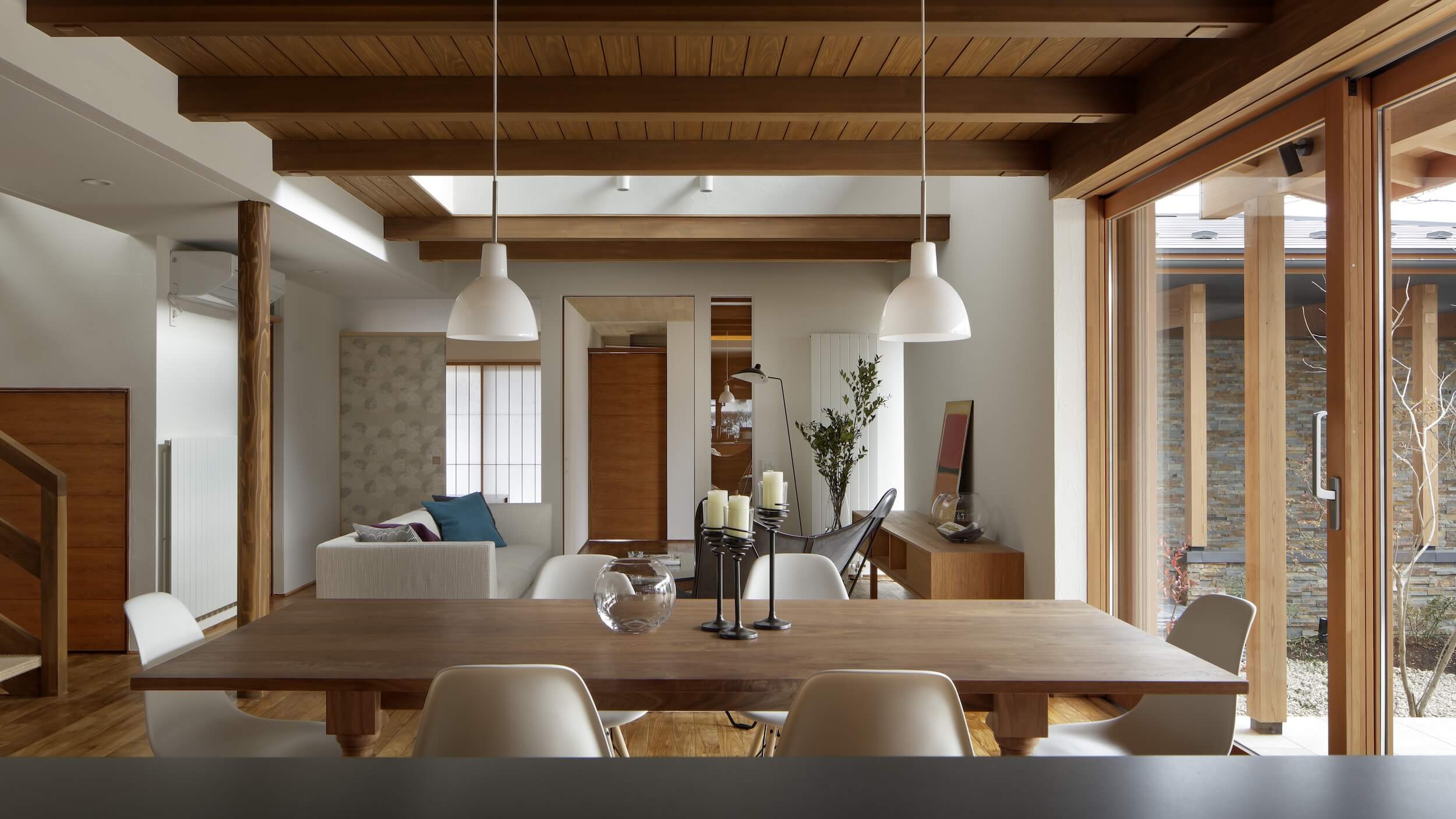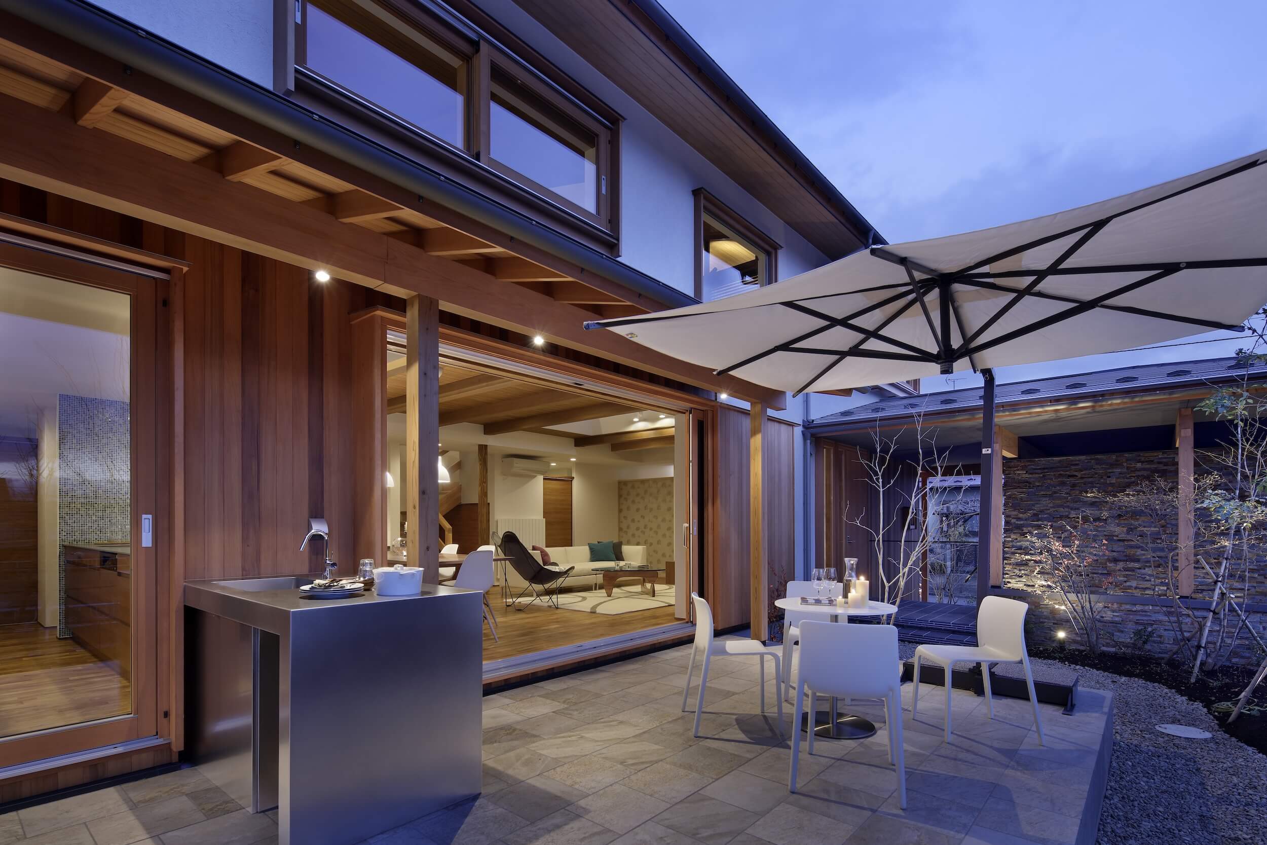夕暮れ時、テラスでグラスを傾けるひととき。 まるで隠れ家リゾートのようなその場所は、遠くへ出かけなくても手に入る「わが家」の光景です。石積みの重厚なアクセントウォールと、温かみのある木の天井が調和するリビングダイニング。大開口の窓を開け放てば、内と外がフラットにつながり、風と光が心地よく通り抜けます。 ブティックのように仕立てたウォークインクローゼットや、家族の気配を感じながら仕事に集中できる書斎スペースなど、美しさだけでなく機能性も追求。 「暮らす」という行為そのものを、優雅なエンターテインメントへと昇華させた一邸です。