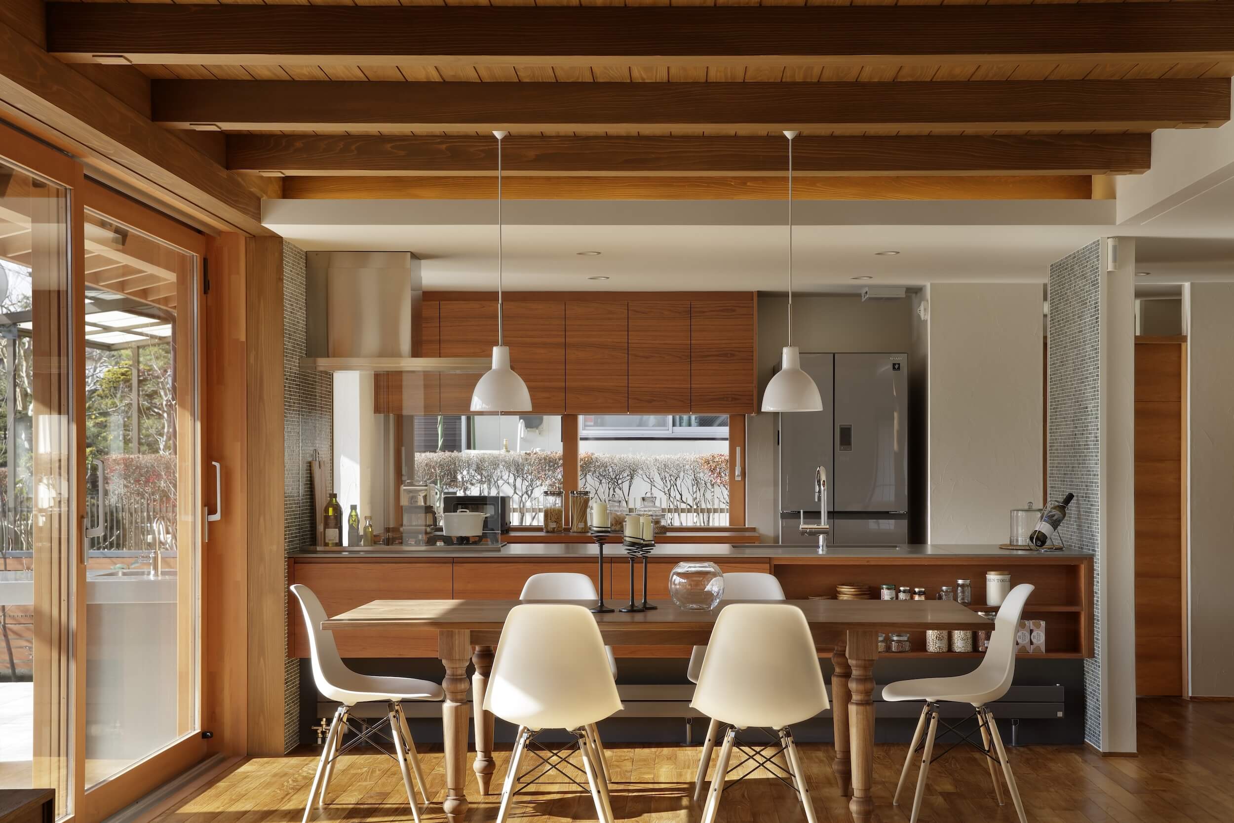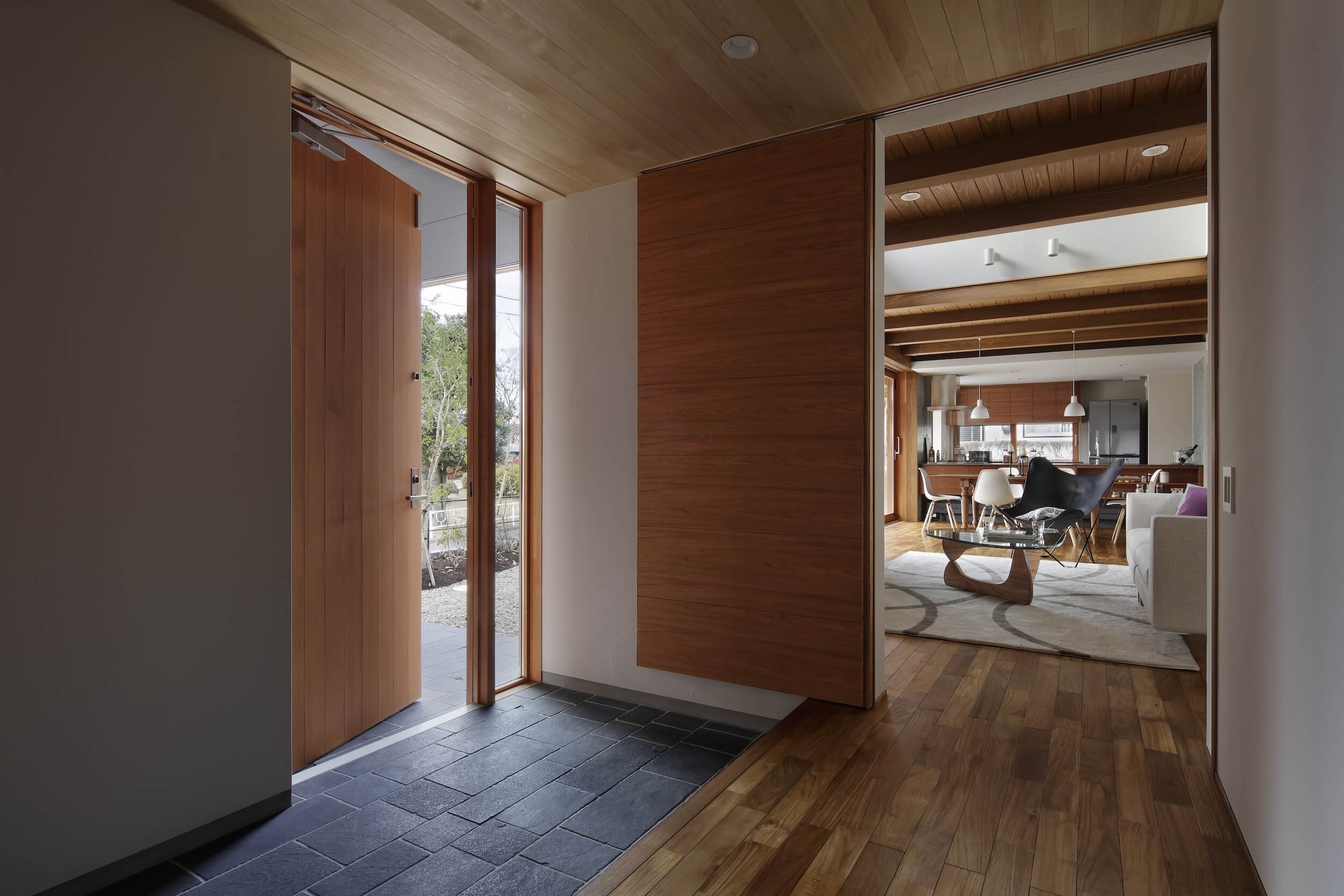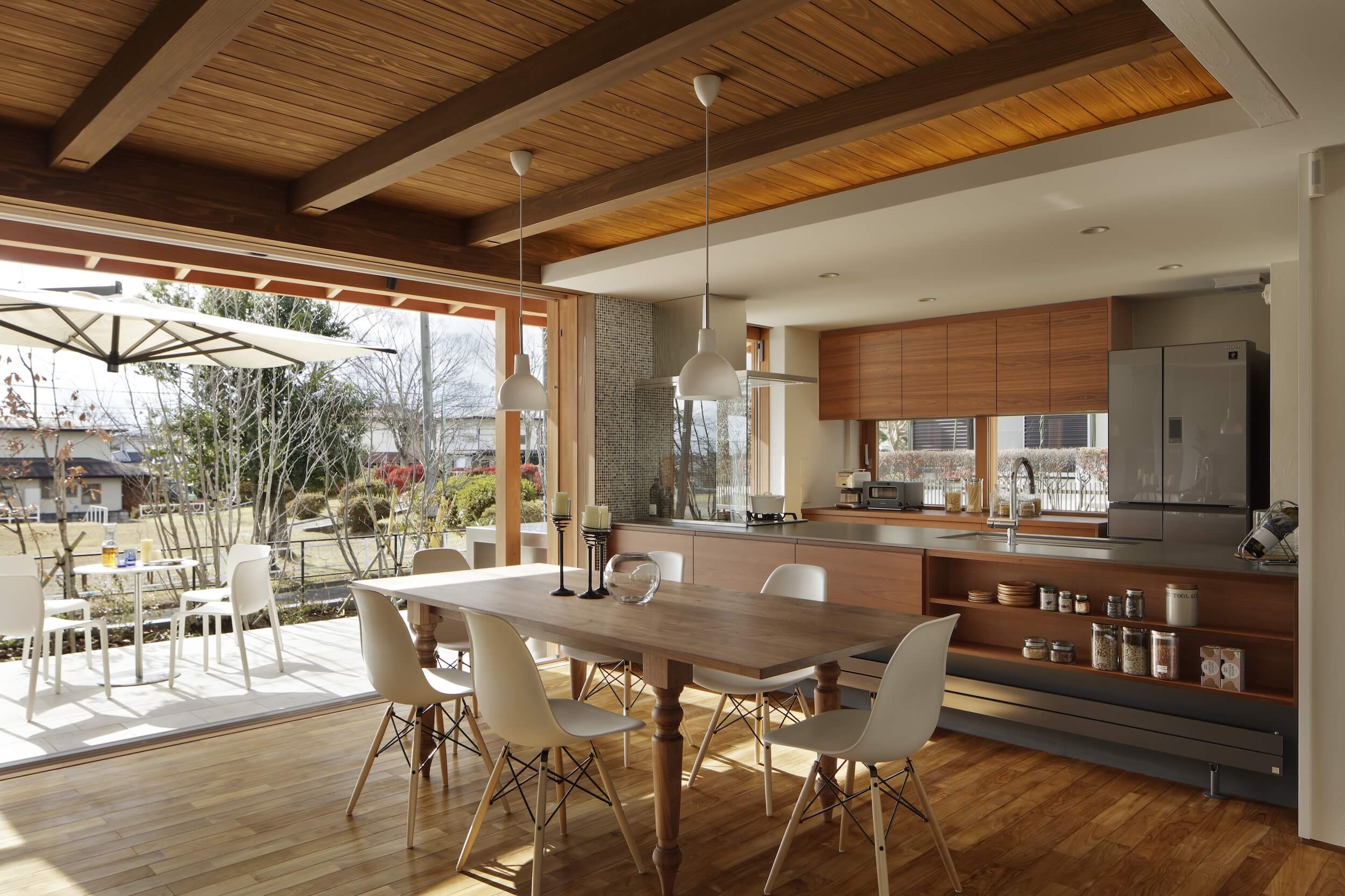 夕暮れ時、テラスでグラスを傾けるひととき。 まるで隠れ家リゾートのようなその場所は、遠くへ出かけなくても手に入る「わが家」の光景です。石積みの重厚なアクセントウォールと、温かみのある木の天井が調和するリビングダイニング。大開口の窓を開け放てば、内と外がフラットにつながり、風と光が心地よく通り抜けます。 ブティックのように仕立てたウォークインクローゼットや、家族の気配を感じながら仕事に集中できる書斎スペースなど、美しさだけでなく機能性も追求。 「暮らす」という行為そのものを、優雅なエンターテインメントへと昇華させた一邸です。